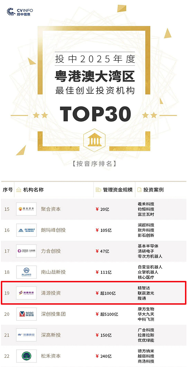 作为国内专业的创业投资机构,清源投资荣获“2025年度粤港澳大湾区最佳创业投资机构Top30”榜单荣誉。